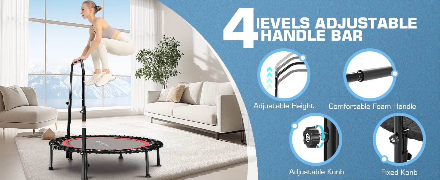 Suitable for All Ages: 4-Level Adjustable Handlebar for Customization: Tailor the foldable trampoline to accommodate different heights effortlessly with its adjustable handlebar. This remarkable feature makes it suitable for user of all ages, ensuring a customized and enjoyable bouncing experience.