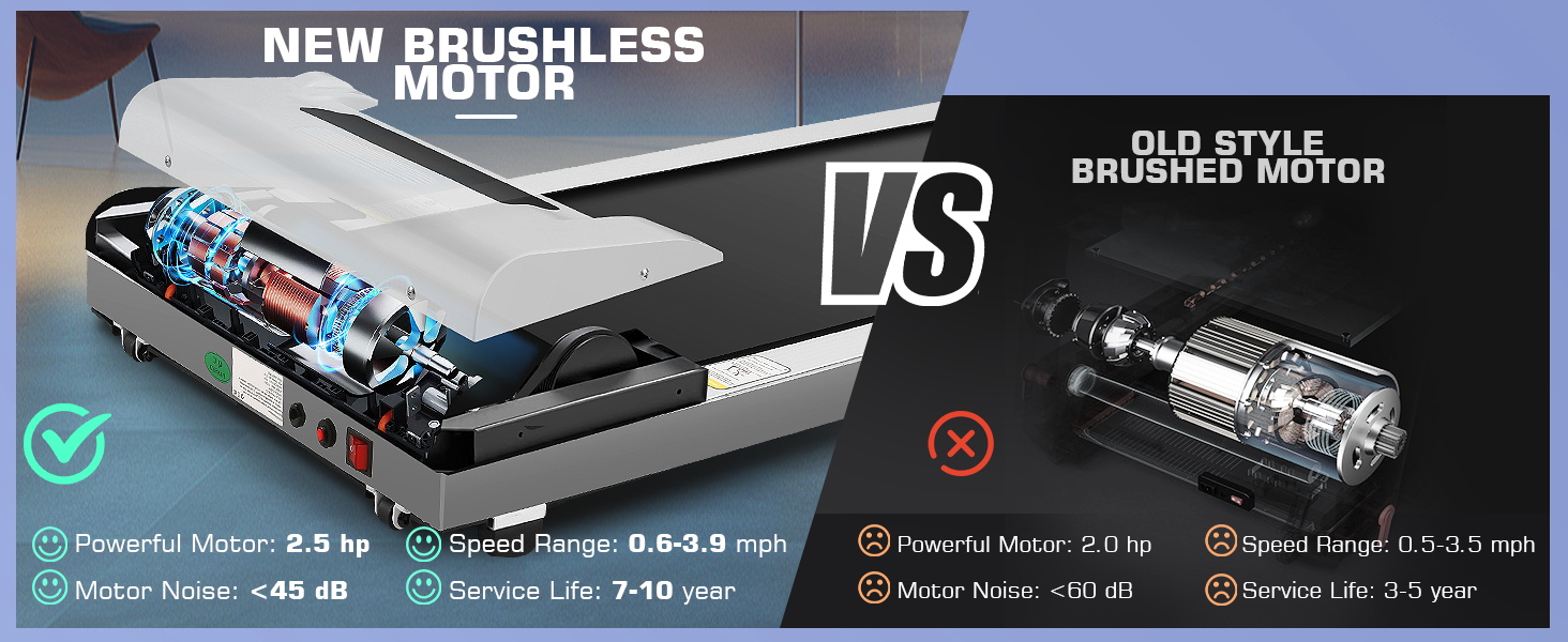 📢【2.5HP Low Energy Consumption Brushless Motor】The powerful and efficient brushless motor improves performance and extends the lifespan of the treadmill. The ANCHEER under desk treadmill features advanced 2.5HP brushless motor technology, making the treadmill more durable and stable while reducing noise and energy consumption. Compared to traditional brushed motors, brushless motors have higher efficiency, lower noise, and longer lifespan.
